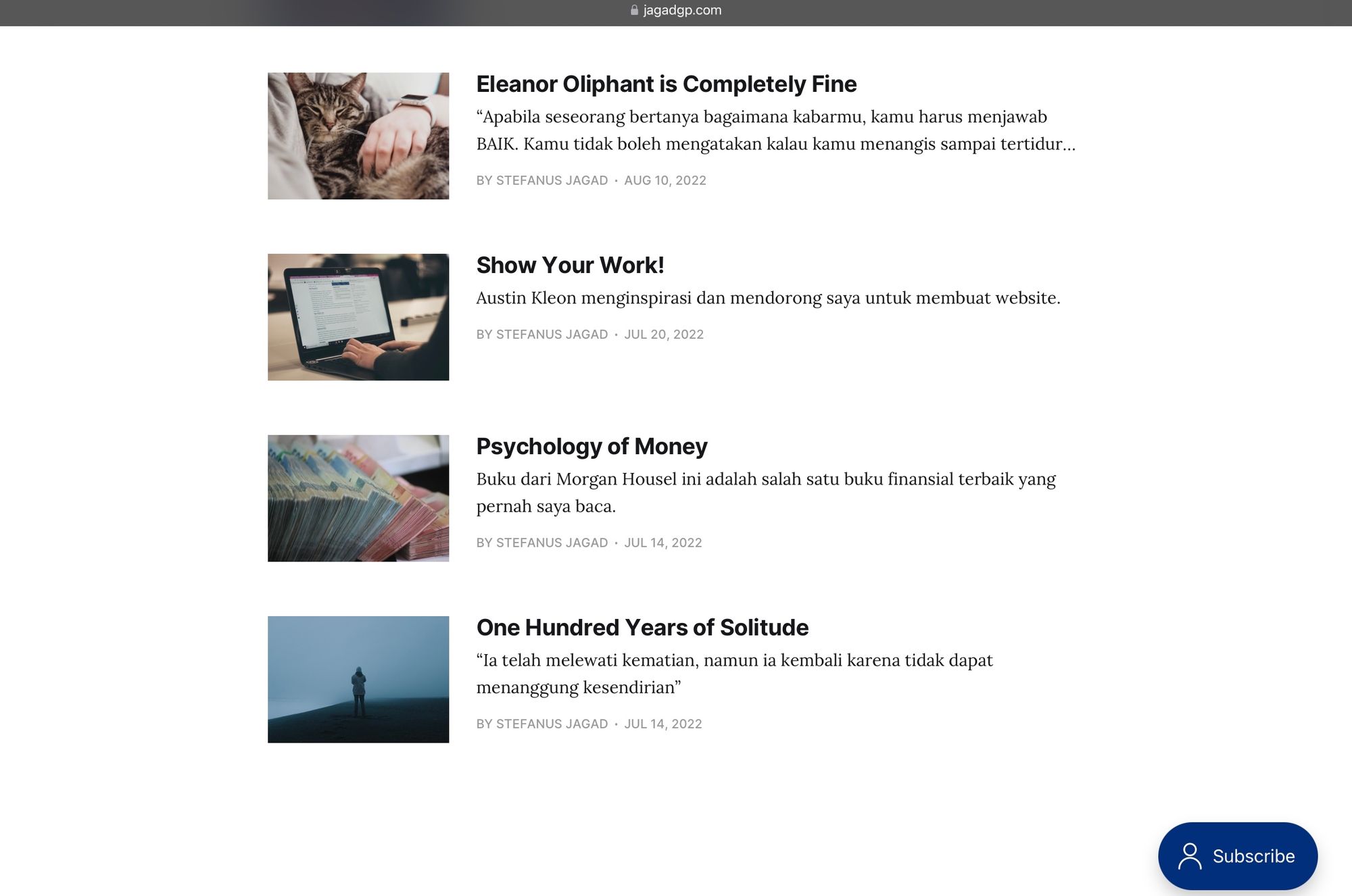 Post pertama saya di website Jagad Raya adalah summary buku One Hundred Years of Solitude dan Psychology of Money. Kedua post ini saya upload pada tanggal 14 Juli 2022, satu tahun yang lalu.