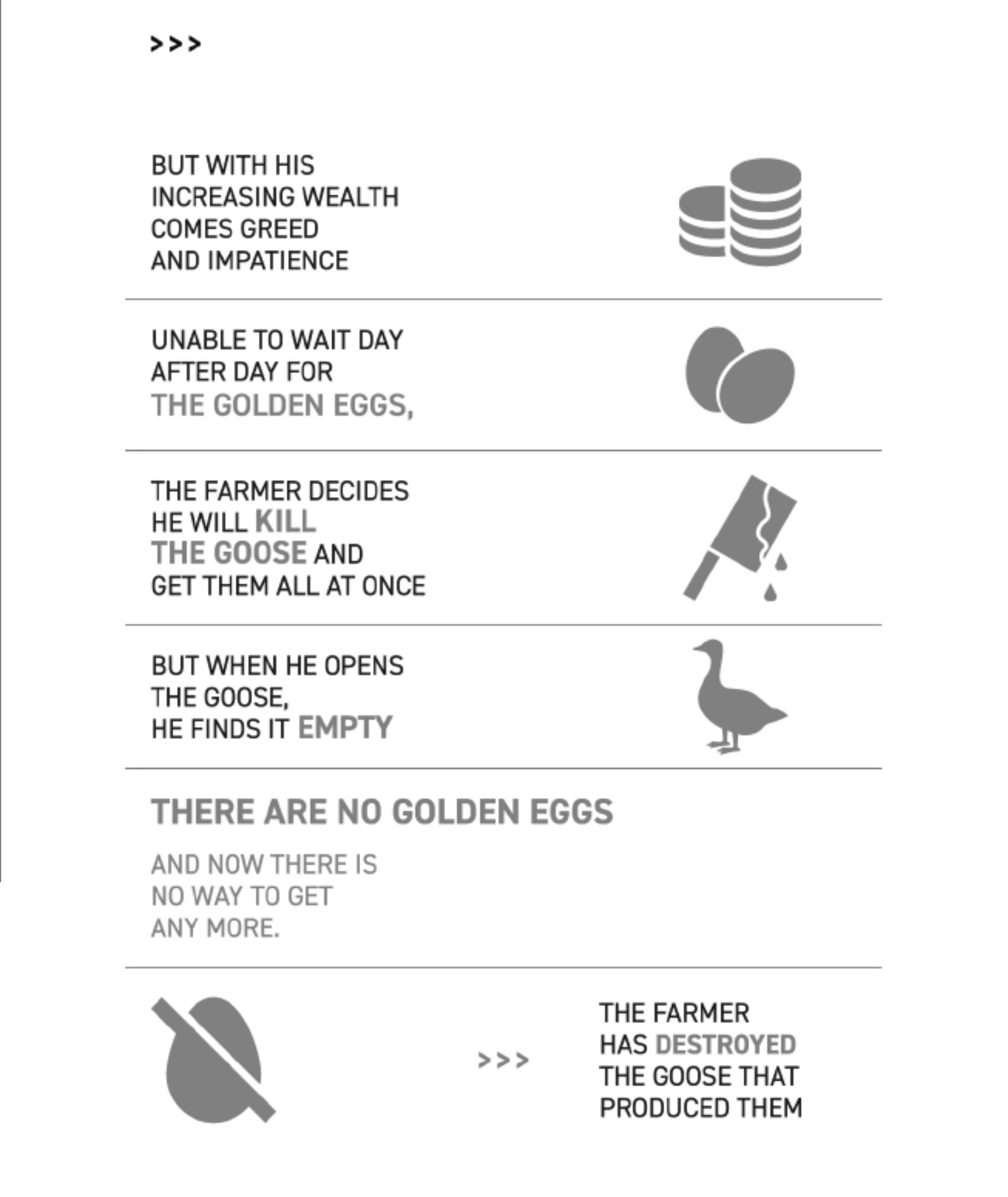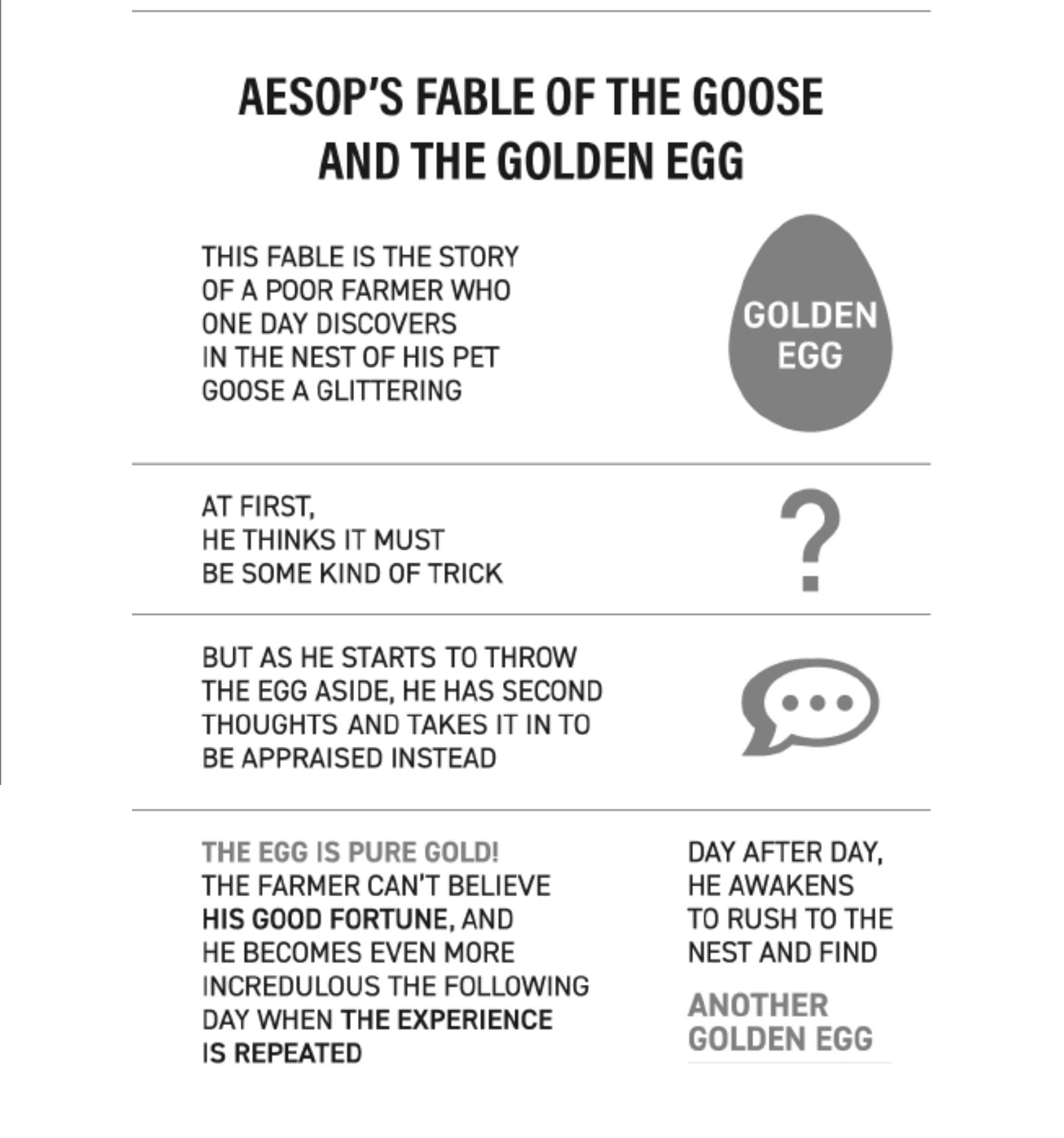 - Kalau kamu memiliki pola hidup yang hanya berfokus pada telur emas saja dan mengabaikan angsanya, maka cepat atau lambat kamu tidak akan memiliki aset yang bisa menghasilkan telur emas. Sebaliknya, kalau kamu hanya merawat angsa tanpa bertujuan untuk mendapat telur emas, maka cepat atau lambat kamu tidak akan bisa memberi makan angsa itu, bahkan dirimu sendiri. Efektivitas berada di tengah-tengahnya.