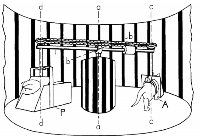 Jadi, eksperimen mereka seperti ini: ada dua anak kucing yang dibesarkan di kegelapan total hingga umur mereka cukup untuk belajar jalan. Lalu, selama 3 jam per hari mereka dipindah ke kotak yang terang dan diikat ke semacam komidi putar. Bedanya, satu kucing bisa meletakkan kakinya ke lantai, sementara kaki kucing satunya diikat dan dibatasi pergerakannya. Kucing yang diikat itu bisa melihat langsung kucing satunya yang belajar berjalan. Observasi ini dilakukan selama delapan minggu sebelum akhirnya mereka dilepas untuk dites.